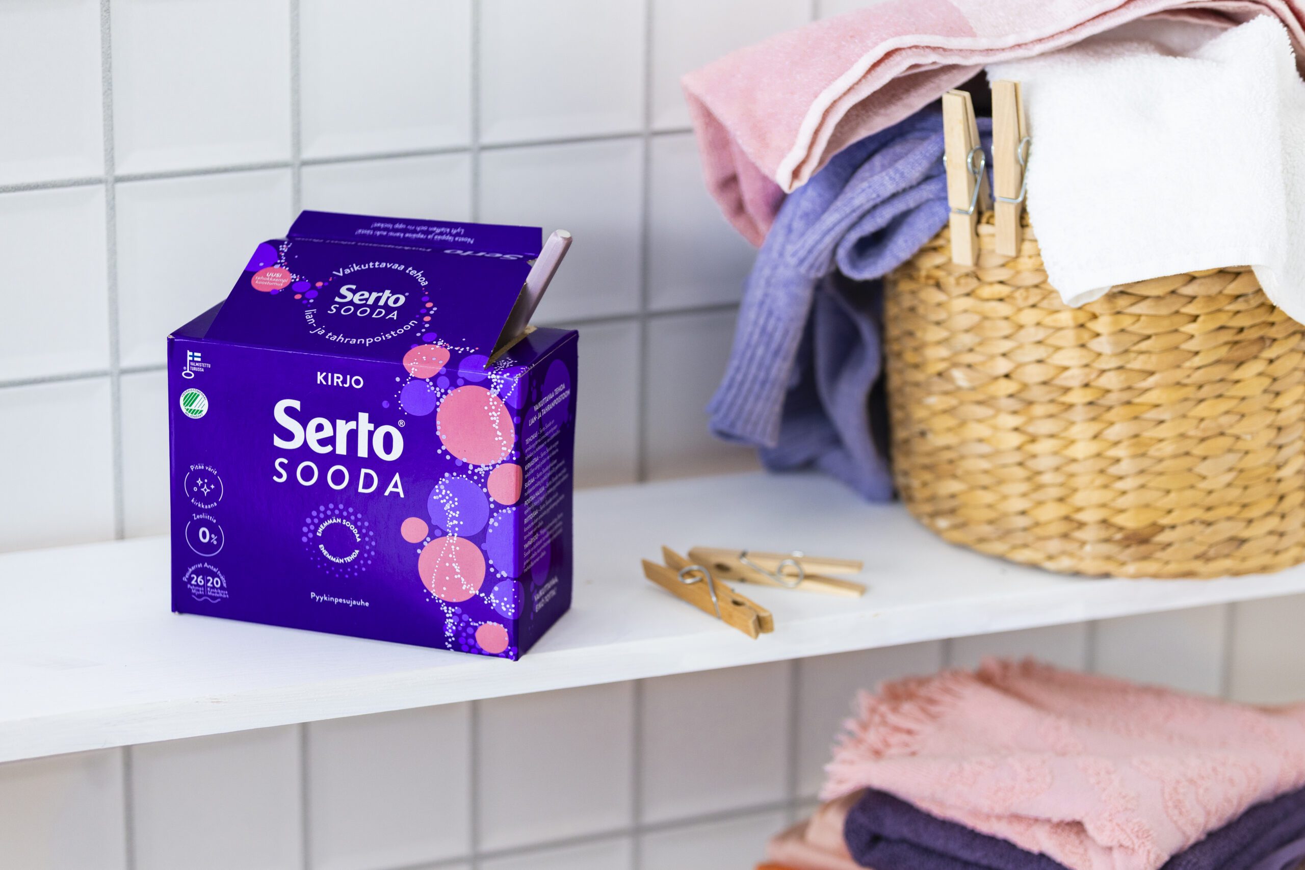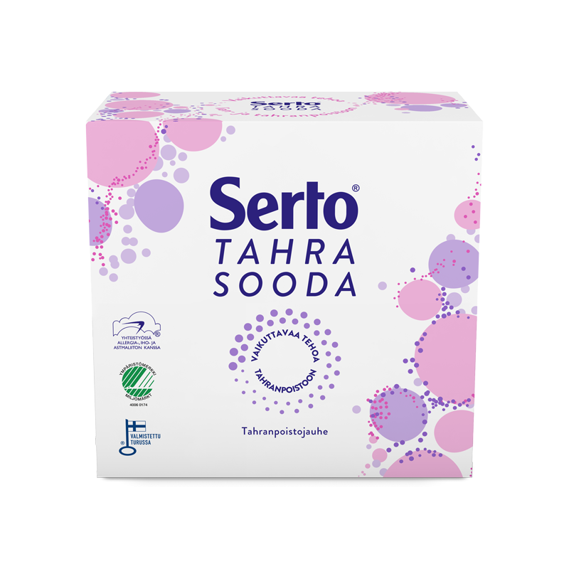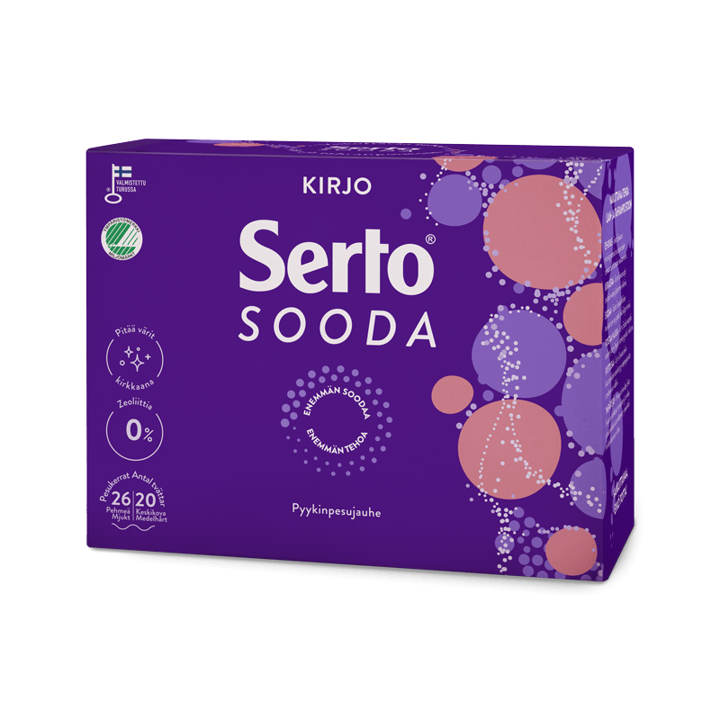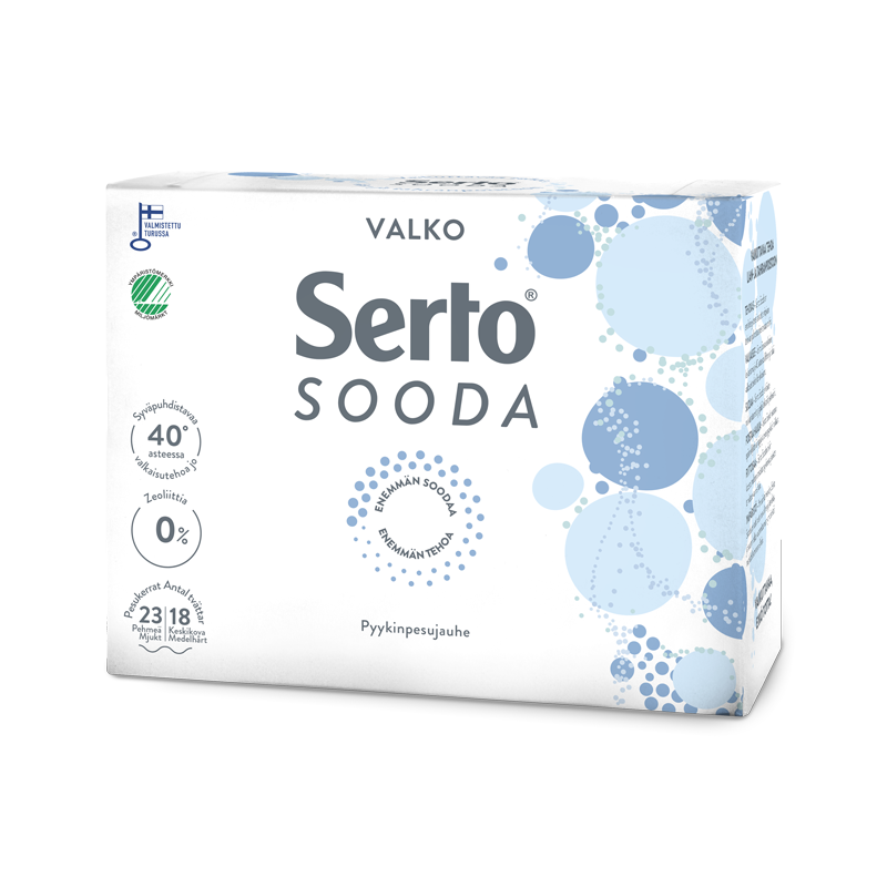 Serto Sooda Valko Pyykinpesujauhe on valkopyykille tarkoitettu uutuusjauhe, jonka valkaisu- ja tahranpoistoteho toimii jo 40 asteessa. Zeoliititon ja fosfonaatiton Serto Tahrasooda Tahranpoistojauhe puree vaikeisiinkin marja-, rasva- ja tärkkelystahroihin tekstiileitä nukkaamatta.